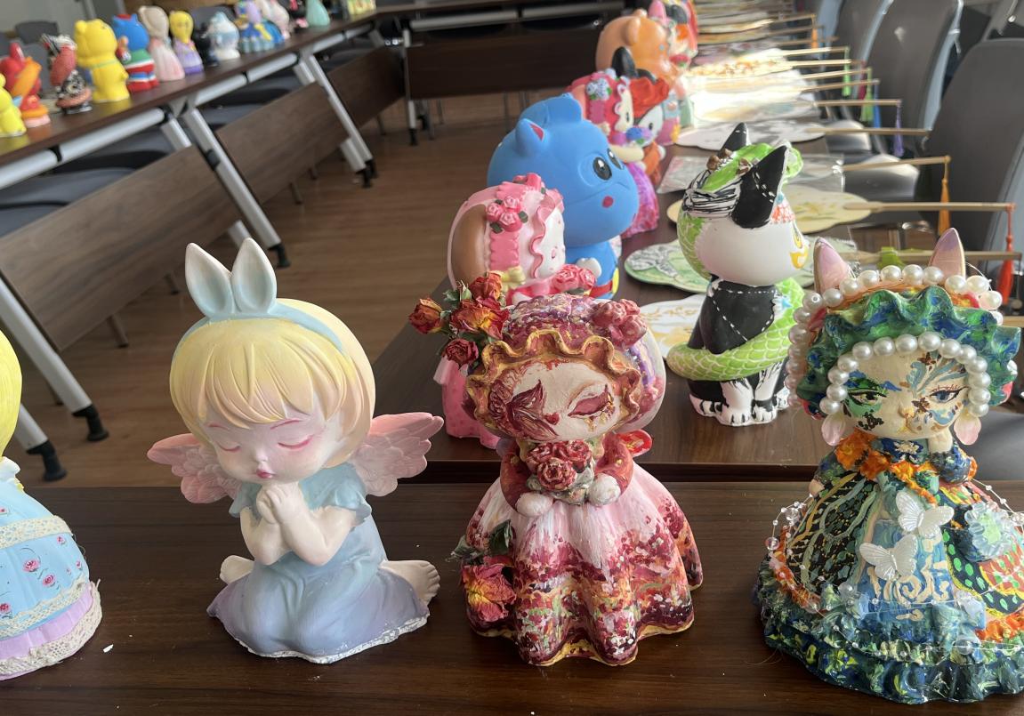 活动通知发布后,便迅速吸引艺术学院学子踊跃报名,积极参与。比赛现场,同学们专注地俯身创作,充分发挥专业特长与想象力:从明快撞色到柔和渐变的色彩搭配,从经典IP复刻到个性抽象的图案设计,从流畅线条的勾勒到精致纹样的细节填充,每一笔都凝聚着对艺术的热爱。有的作品将“海绵宝宝”“玲娜贝儿”等经典卡通形象还原得灵动鲜活,有的以原创插画传递校园生活韵味,还有的凭借莫兰迪色系打造简约治愈风格。原本素净的石膏娃娃,在同学们的妙笔之下渐渐“活”了起来,成为承载创意灵感与青春气息的独特载体。